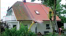 Unser Champion packt gründlich an. Ähnlich dem Rasenmäherprinzip erhalten wir gleichbleibende Ergebnisse. Durch eine spezielle Düsenkombination wird auch der kritische Unterkantenbereich sauber. Ein Meilenstein in der Dachreinigung.